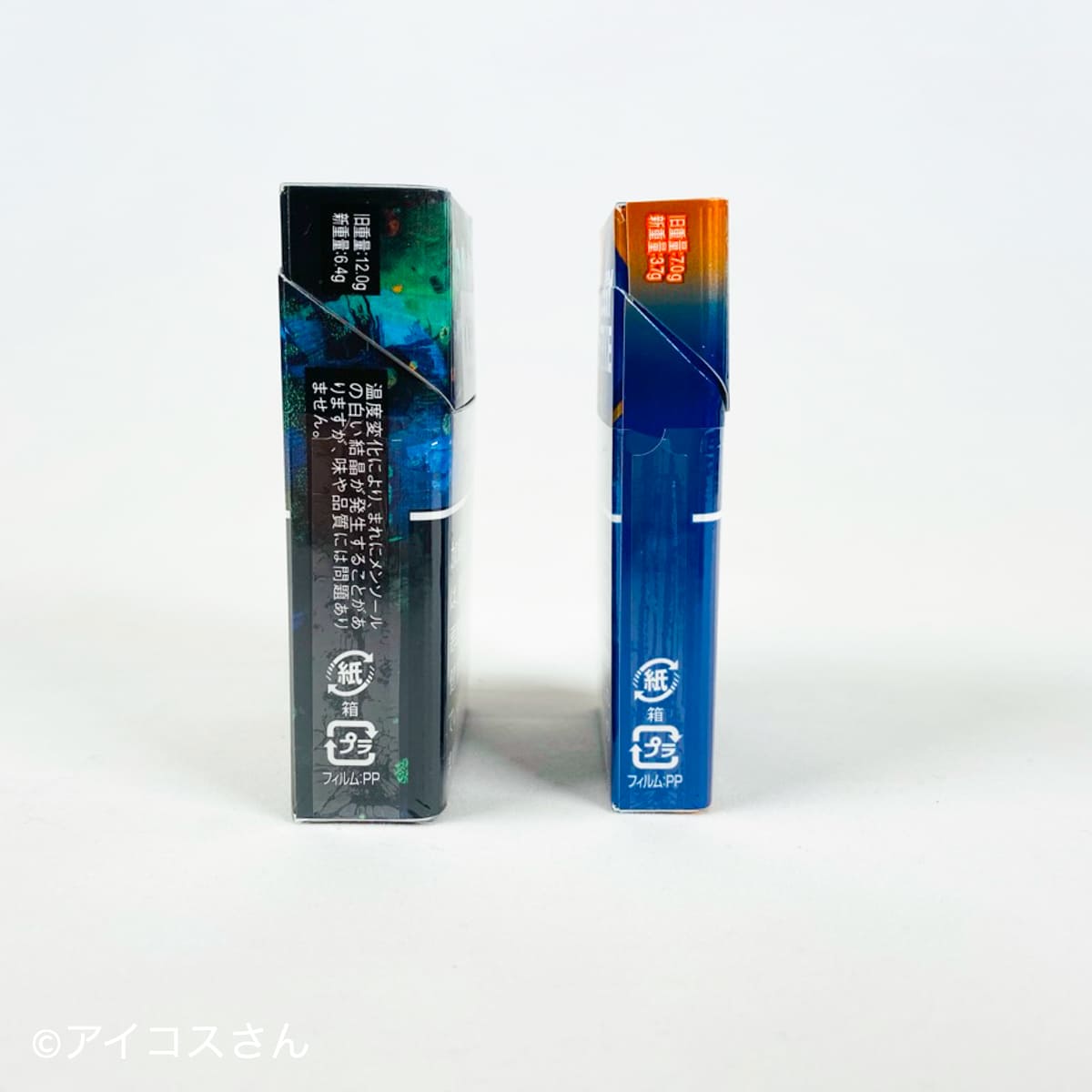 前述のとおり、たばこ増税が続いている中、500円以下のたばこというだけで激安な印象があります。なのに、290円のたばこということなので、どういうこと?と思われると思います。実はこの「ラッキーストライク」は290円の価格を実現するために、1箱12本入りというコンパクトサイズのパッケージになっています。通常のグローハイパー銘柄のパッケージと比較すると、その”小ささ”がよくわかります。