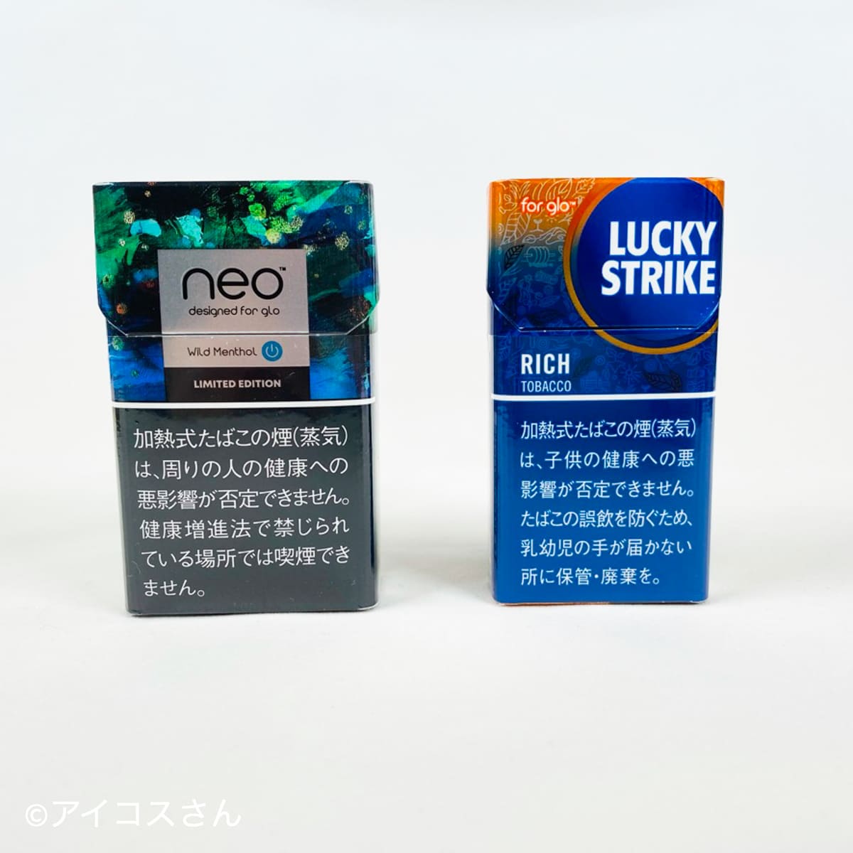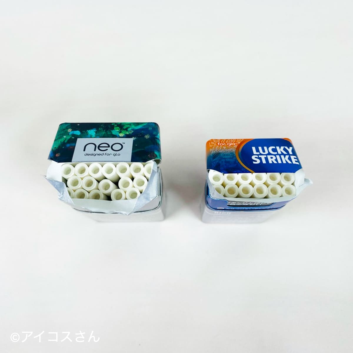 グローハイパー専用スティック。左が20本入りの「ネオ」、右が12本入りの「ラッキーストライク」[/caption]