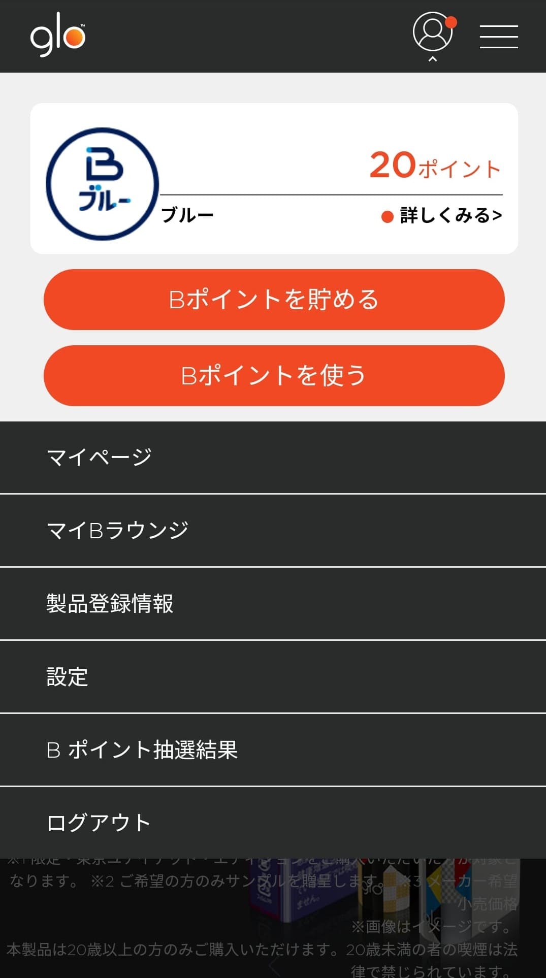 グローの公式サイトにアクセスし、メンバー登録したメールアドレスとパスワードでマイページにログインします。 右上のアカウントマークをタップするとプルダウンでメニューが表示されるので「製品登録情報」を選びましょう。 [caption id="attachment_18907" align="aligncenter" width="350"]