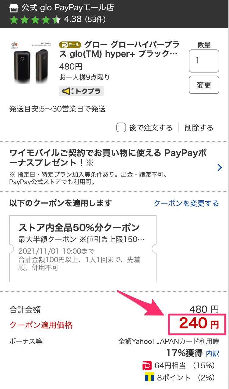 定価480円のグローハイパープラスがクーポン適用で240円になりました。[/caption]