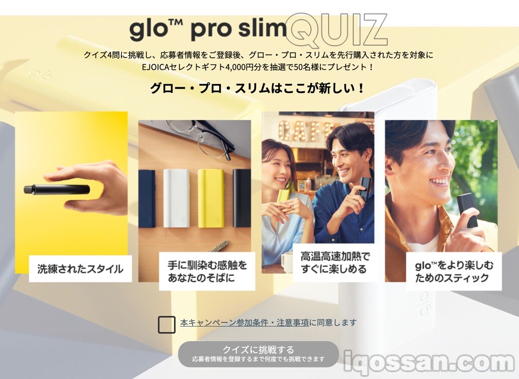 glo™メンバー限定先行発売開始 9月21日の一般販売に先駆けて9月16日よりglo™メンバー限定で新製品グロー・プロ・スリムの先行販売を開始!クイズに参加し、応募者情報をご登録後、ページ内の“購入する”ボタンから本製品の先行販売に参加できます。 さらに、クイズに最後まで挑戦し、ページ内のリンクから グロー・プロ・スリムをご購入された方を対象に、EJOICAセレクトギフト4,000円分を抽選で50名様にプレゼント! 先行販売期間:2021年9月16日 18:00~9月20日 11:59 [say name="アイコスさん" img="https://iqossan.com/wp-content/uploads/senpai_01.png" from="right"]4,000円のギフトは…もらえたらラッキー![/say] [say name="アイコスさん" img="https://iqossan.com/wp-content/uploads/senpai_03.png" from="right"]ただし、今回の先行販売は通常発売日9月21日までのお届けを約束するものではないことに注意しましょう。[/say]