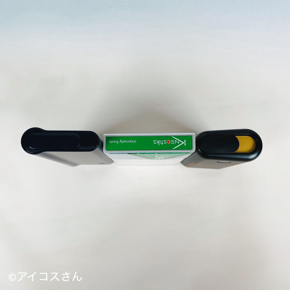 ただし、加熱式たばこデバイスを並べて改めて思うこともあります。 [say name="アイコスさん" img="https://iqossan.com/wp-content/uploads/senpai_03.png" from="right"]「グロープロスリム」…意外と大きいな?[/say] という気持ちです。 [caption id="attachment_18097" align="aligncenter" width="600"]