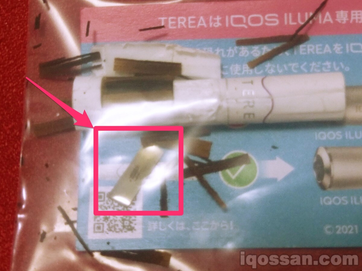 しかし、加熱ブレードがない・・・のにも関わらず、これまでのアイコスと同じく内側加熱することが可能です。それを可能にしているのが、テリアに内包されている金属体です。