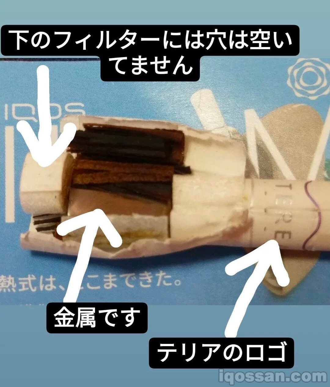 実際に「テリア」のスティック内部には金属体が入っていることが確認できました。なおこちらの画像はアイコスさんTwitterのフォロワーである、ゆい様より頂きました。いつも大変感謝です。