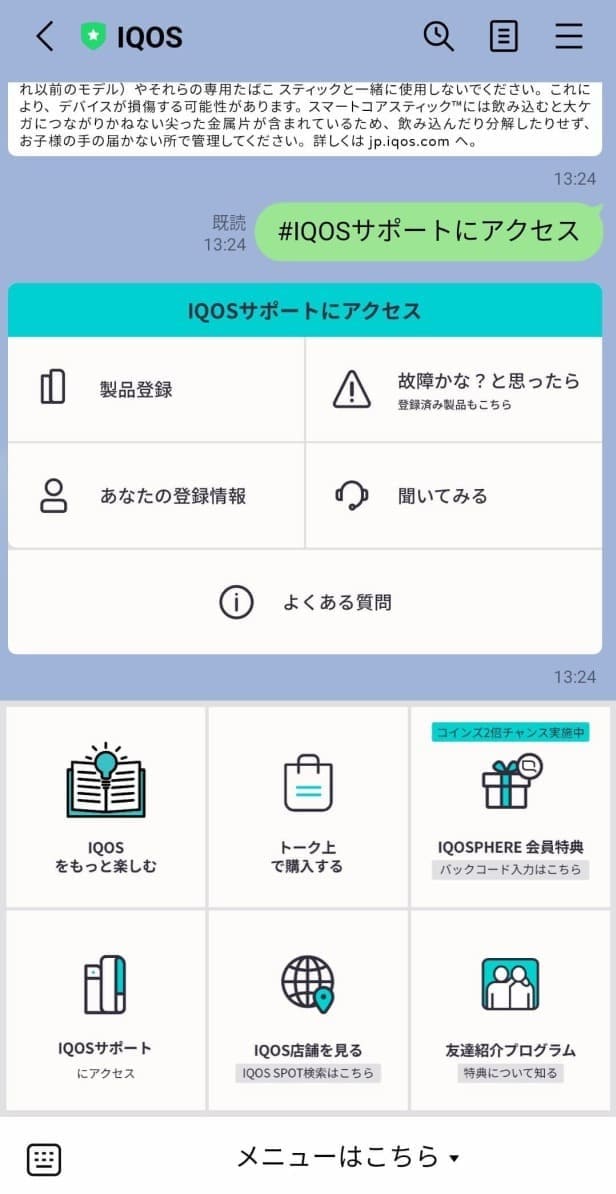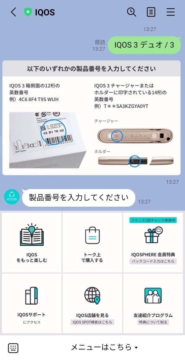 LINEのトーク画面で「IQOSサポート」から製品登録を選択します。[/caption]